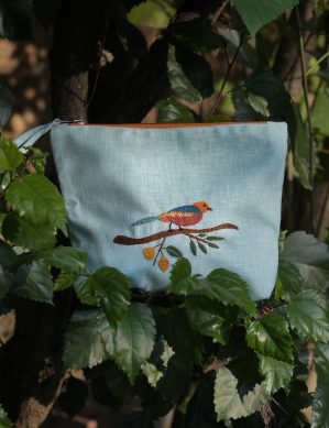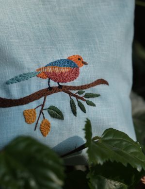 A tiny bird perched softly on a branch, stitched against a calm sky-blue canvas.